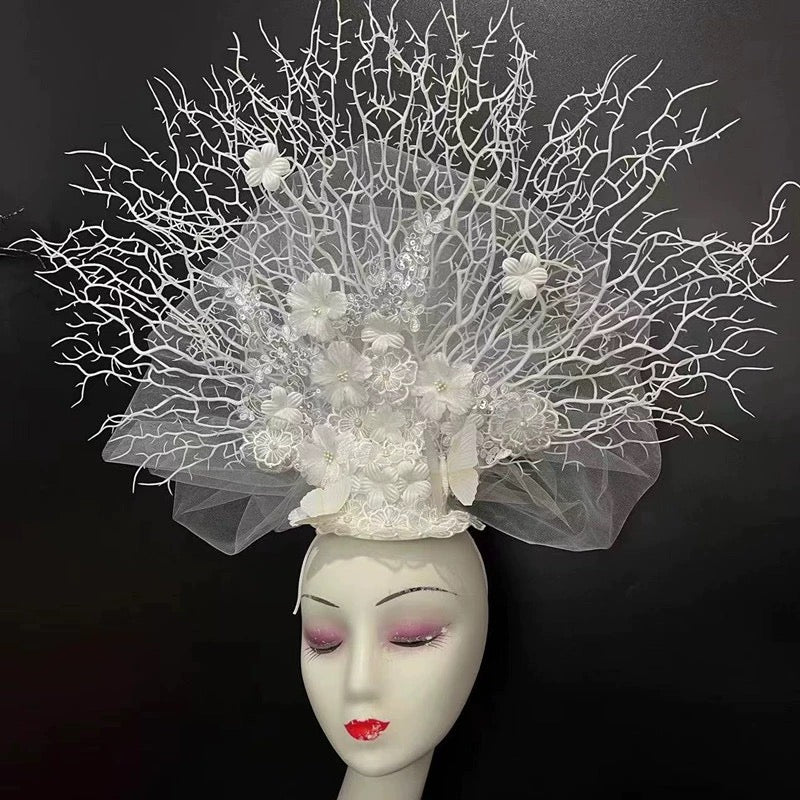 Crafted with an eye for elegance and a nod to the natural world, the "Verdant Verve" headpiece is a testament to the beauty of botanical forms. It's a captivating accessory that's well-suited for avant-garde fashion, theatrical productions, or as a standout piece in a floral-themed event. This headpiece is not just an accessory; it is a statement of life and growth, a wearable sculpture that transforms the wearer into a moving piece of art.
